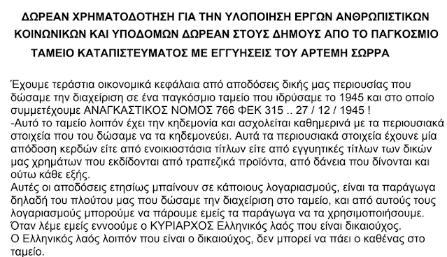 ΕΔΩ ΛΟΙΠΟΝ ΕΡΧΕΤΑΙ Ο ΑΡΤΕΜΗΣ ΣΩΡΡΑΣ ΜΕ ΕΤΟΙΜΗ ΠΡΟΤΑΣΗ ΚΑΤΑΘΕΤΟΝΤΑΣ ΜΕΛΕΤΕΣ 49.000 ΕΡΓΩΝ ΥΠΟΔΟΜΩΝ ΑΝΘΡΩΠΙΣΤΙΚΩΝ ΚΑΙ ΚΟΙΝΩΝΙΚΩΝ ΠΑΡΟΧΩΝ ΚΑΙ ΕΠΕΝΔΥΤΙΚΩΝ ΑΝΑΠΤΥΞΙΑΚΩΝ ΕΡΓΩΝ ΓΙΑ ΚΑΘΕ ΔΗΜΟ ΤΗΣ ΕΛΛΑΔΑΣ ΚΑΤΑΒΑΛΛΟΝΤΑΣ Ο ΙΔΙΟΣ ΤΙΣ ΔΙΚΕΣ ΤΟΥ ΕΓΓΥΗΣΕΙΣ, ΑΝΑΛΑΜΒΑΝΟΝΤΑΣ ΤΗΝ ΕΠΙΣΤΡΟΦΗ ΤΩΝ ΧΡΗΜΑΤΩΝ ΣΤΟ ΤΑΜΕΙΟ ΣΕ 50 ΧΡΟΝΙΑ ΑΤΟΚΑ.